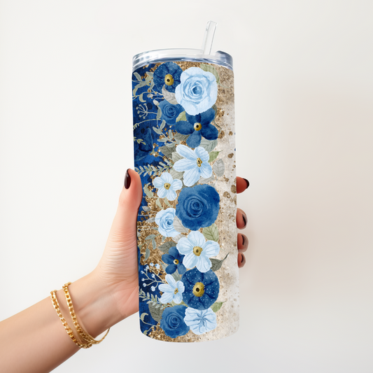 Personalized Blue Floral 20oz Skinny Tumbler with Straw